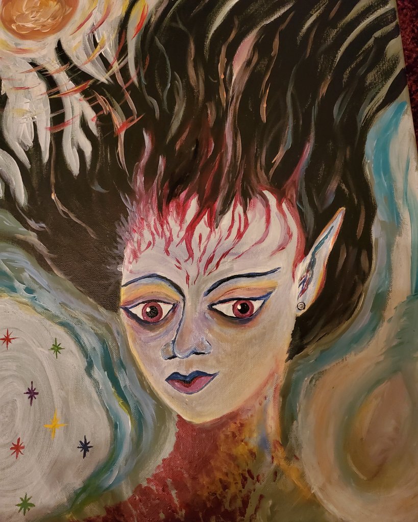 I made this painting recently and it felt a little different than the other beings I typically paint, especially once it was finished. Wondering who this being is or where they are being ‘channeled’ from? There is also a solar presence that I was being directed by spirit to add to the image; I felt the painting was not done until the yellow was added along with the Sun in the top left corner. This work feels like a blending of the fire and air elements. The bottom left corner feels kind of like a portal. If anyone has any insights on the entity I painted let me know!
